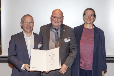 Dr.-Ing. Jörg Kleff and Dr.-Ing. Thomas Lübben were awarded the AWT badge of honor for their commitment to numerous AWT committees. The laudatory speech for Mr. Kleff was held by Dr. Matthias Steinbacher. He emphasized Mr. Kleff's extraordinary commitment to the AWT technical committees, project-related committees and the AWT board. The laudatory speech for Dr. Lübben was delivered by Gunther Schmitt. He praised his many years of voluntary commitment to the technical committee 15, the organization of conferences and research into dimensional and shape changes in manufacturing.